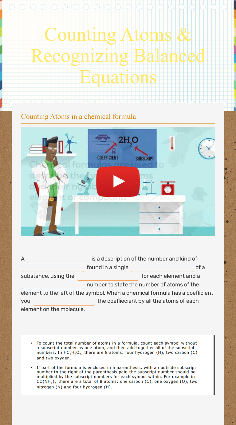 Chemical Formulas And Counting Atoms Interactive Worksheet By Katie Swanson Wizer Me from dynamic.wizer.me Al + cu2s →al2s + cu. Count the number of atoms of each type on each side of the equation. Need more help, use this worksheet Hints on back of this page: View counting+atoms+student.doc from snc1dt grade 9 sc at north park secondary school. Now fill out the google doc with the terms needed to count atoms and write formulas. Interactive worksheet counting atoms in a formula. A subscript is the small number below a(n) ______ that tells the number of ______ of that element.
